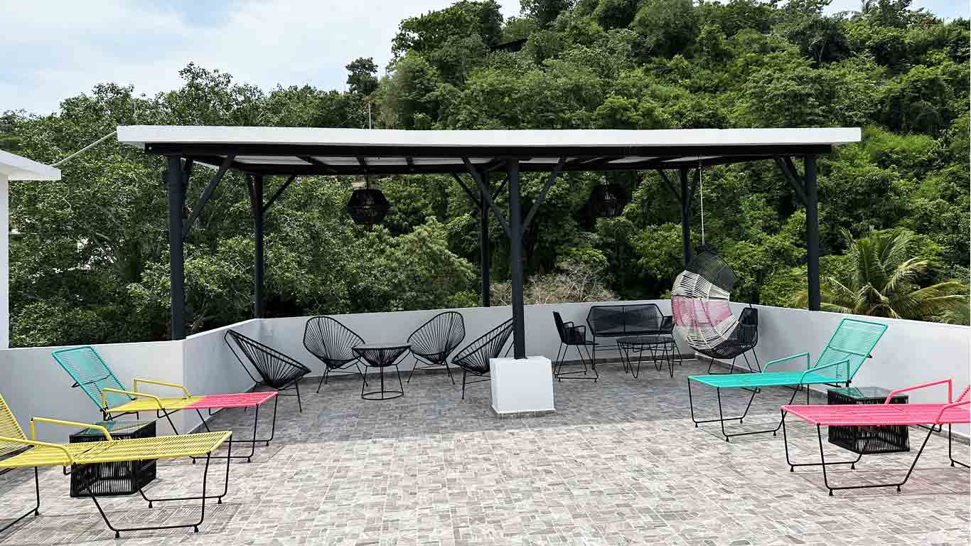 These are equipped with everything you might need for a short to medium term stay, bathroom, a queen bed, a kitchenette, dining table and a balcony. The building has a roof garden to enjoy the views of the lush mountain on the back.